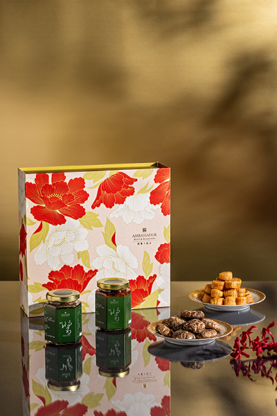 禮盒內容包含兩瓶國賓人氣商品「干貝XO醬」,搭配象徵富貴吉祥的「花菇」與「干貝」,是年節送禮首選